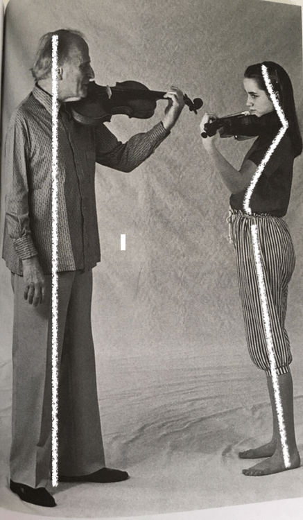 Comme l’explique très justement Madame Dominique Hoppenot dans son livre « le violon intérieur » (pages 56 et 57) : « la clavicule et le maxillaire gauches formeront alors un étau naturel et souple où le violon peut se placer sans peine. » Ce sera alors un dos tonique et sans tension qui accueillera le violon sans autre effort que l’équilibre corporel global. Le musicien et son violon formeront un tout ; l’instrument sera le prolongement du dos, des bras, de la pensée musicale.